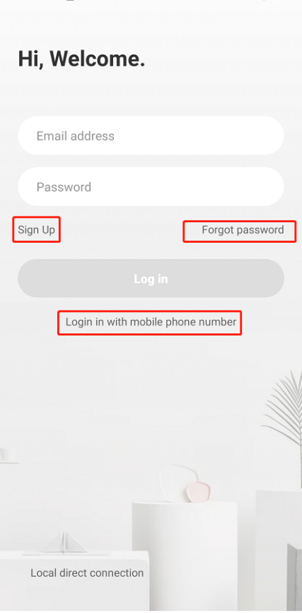 - When you use this app at the first time, you need to use your email to register an account, click" Sign Up” and set a password according this procedure, or choose Log in with mobile phone number.