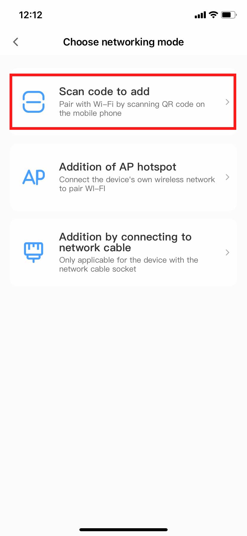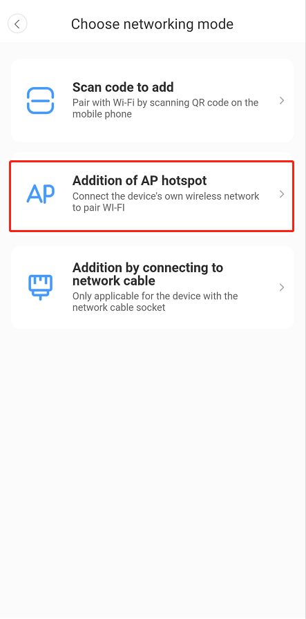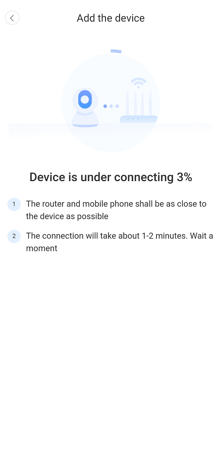 - A、 If you can’t go to the second step, please check your Wi-Fi channel is not hidden, and the Wi-Fi router can’t be so far from the camera, If this way doesn’t work, please scan the QR code to add the camera.