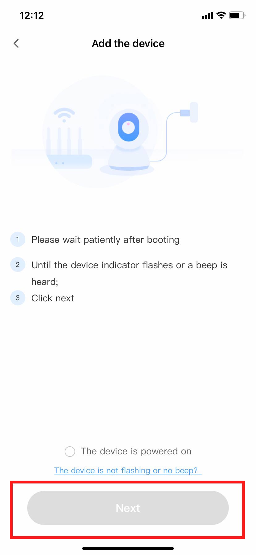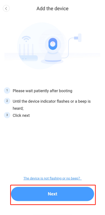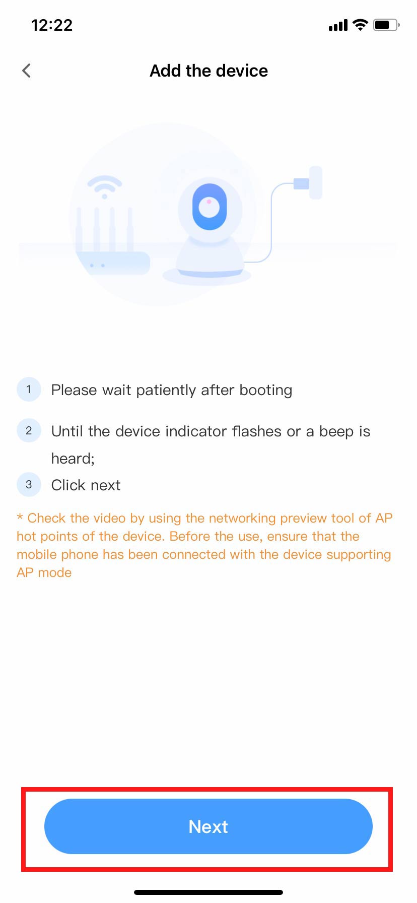 - Choose the Addition of AP hotspot, Plug in the power to the camera, Wait patiently for the device light to blink or hear a tone, Click Next when done.