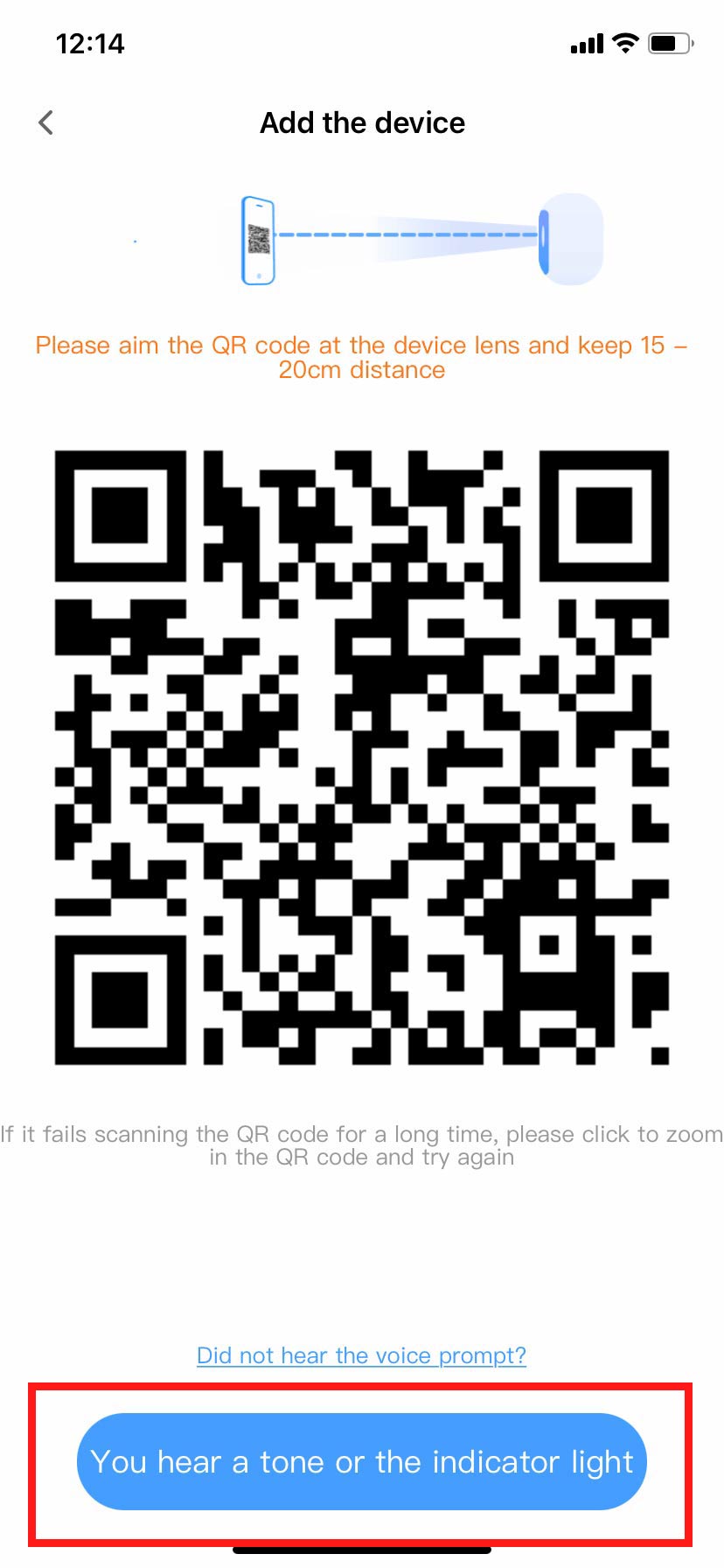 - Scan the camera lens toward the QR code of the phone,(Align the QR code with camera lens at a distance of 10-20cm)Hear a voice prompt, Click "When you hear a beep or a green light” after hearing the beep, Keep the camera case close as possible to the router, The connection process takes about 1-2minutes, after you will hear welcome to use camera.