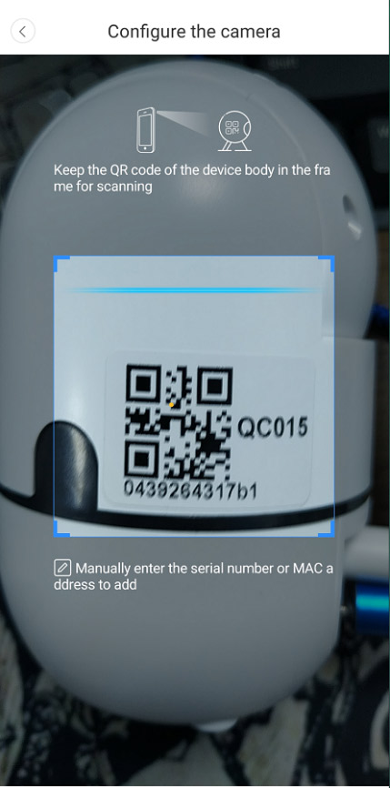 - Plug in the power to the camera, Device network port is connected to the network cable Scan device body QR code, put the QR code on the device body into the box and scan it.