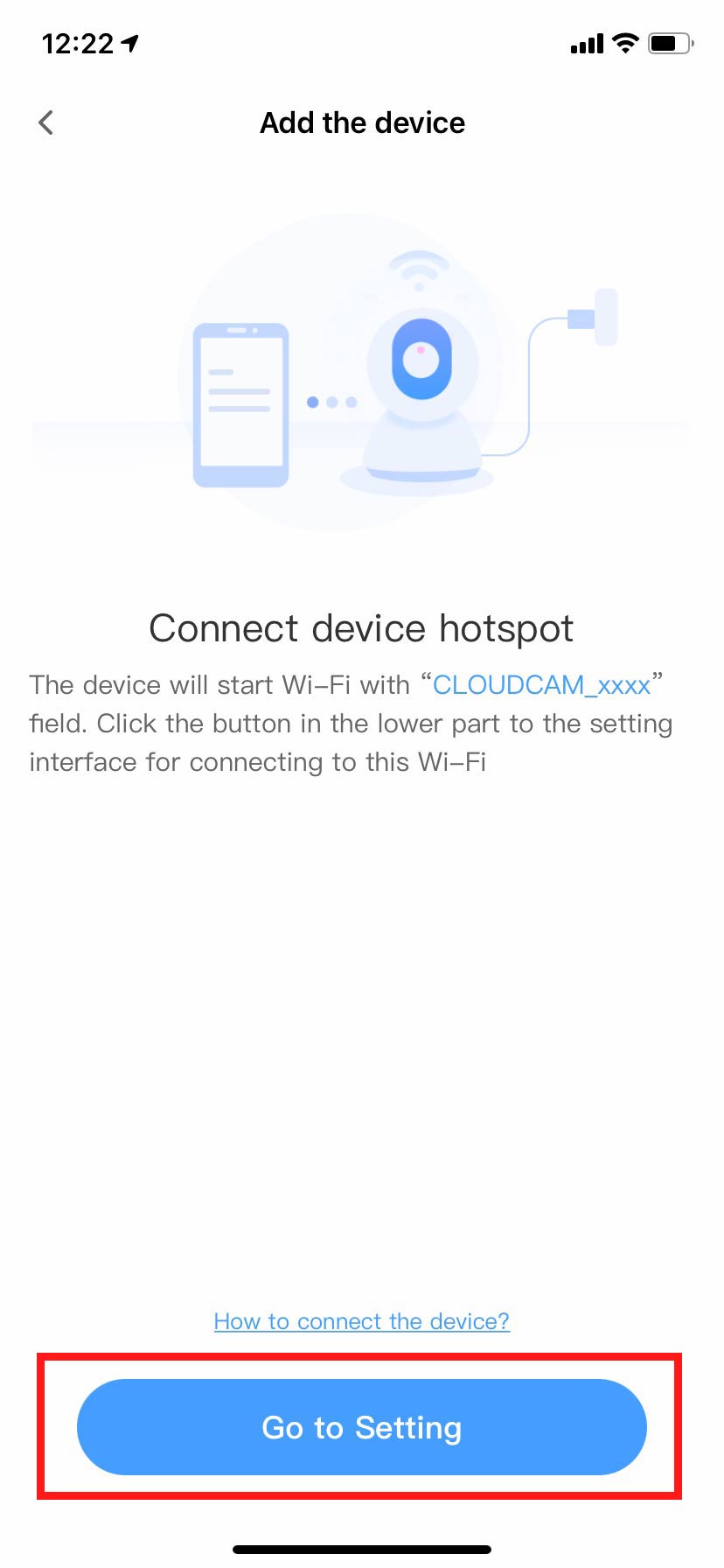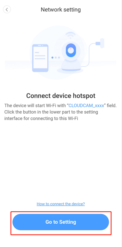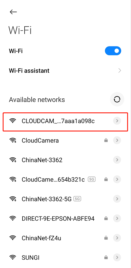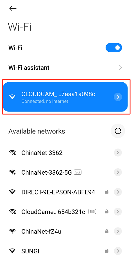 - please go to the Wi-Fi list and connect the Wi-Fi in the blue field “CLOUDCAM_XXXX” Select the Wi-Fi that matches the prefix and connect Return to APP after successful connection.